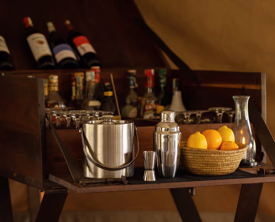 Dining and relaxing take place in a single combined mess and lounge tent, designed to let the African breeze flow through. Menus are individually crafted to guest preferences and paired with a curated selection of southern African wines, beers, and soft drinks. A full bar is always available.